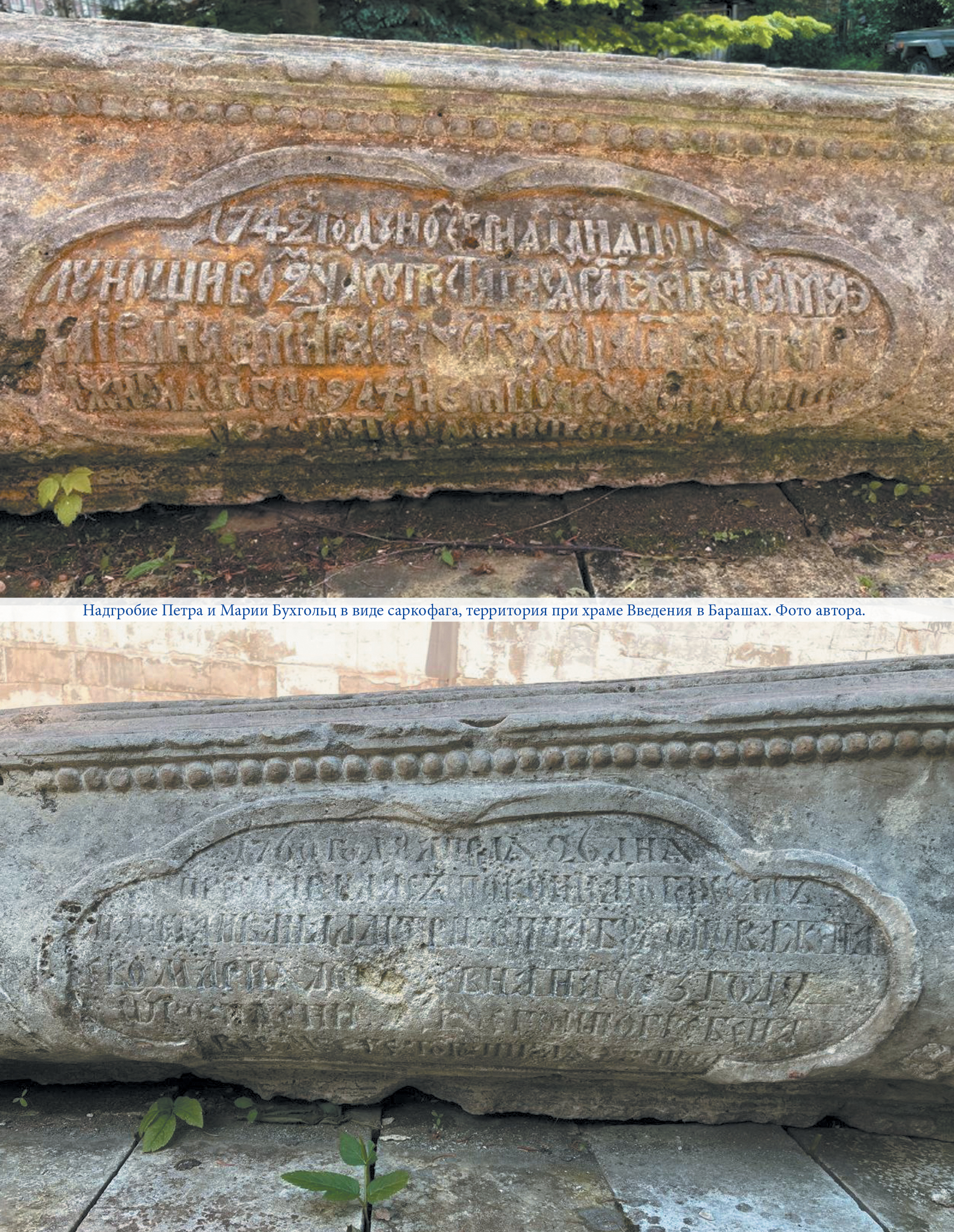 В 1993 году храм Введения в Барашах был передан Русской Православной Церкви. Сейчас на территории храма находятся два надгробия, одно из которых обнаруживает признаки стилистического и технологического сходства с надгробием Д. А. Траурнихта из собрания Музея Москвы. В результате внешнего осмотра надгробий удалось установить, что надгробие, выполненное в виде саркофага, отмечало захоронение сына И. Д. Бухгольца Петра Ивановича Бухгольца и супруги И. Д. Бухгольца Марии. На одной из сторон надгробия в картуше уверенно читаются первые строки эпитафии:
